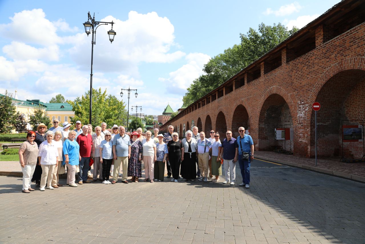 14 июля мы приехали в Нижний Новгород. Едва поезд прибыл на перрон, грянула «Величальная» песня. С хлебом и солью нашу делегацию встречал богородский ансамбль «Здравица», где солировала его руководитель Татьяна Большухина. Слова приветствия прозвучали от руководителей областного Совета ветеранов. И мы поехали знакомиться с древним городом на нижнем течении Волги, отсюда название - Нижний Новгород. Первая остановка автобуса - у памятника Александру Невскому, небесному покровителю Санкт-Петербурга. Подошли к Волге, восхитились величием этой русской реки, увидели место, где в нее впадает Ока. Дорога к Кремлю проходила по знаменитой Большой Покровской улице. Это древняя дорога от стен Нижегородского Кремля в сторону Москвы. В 18 веке здесь располагались усадьбы самых именитых дворян России: Черкасских, Волконских, Трубецких… Здесь сохранились старинные дома, вывески магазинов, много памятников.